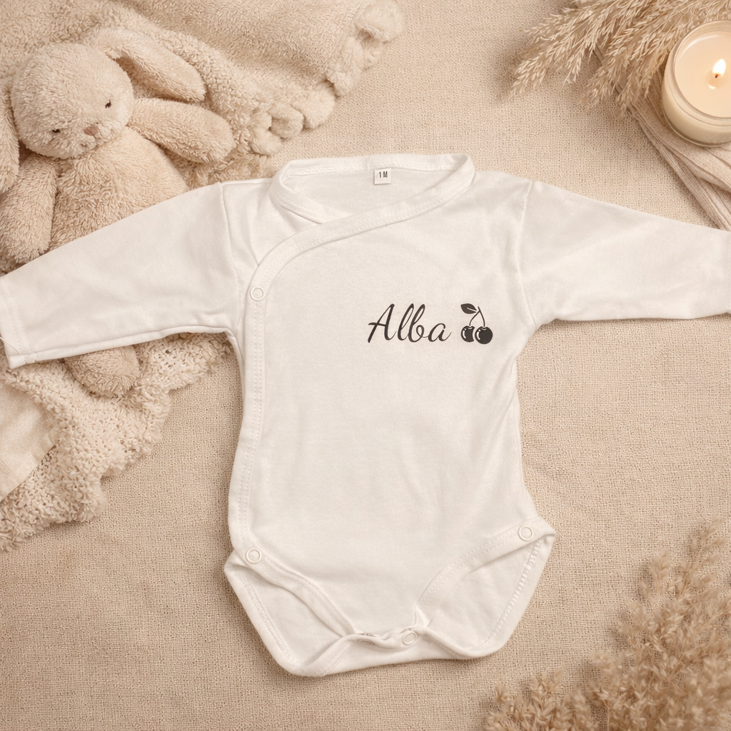 Offrez un cadeau tendre et unique avec ce body bébé personnalisé au style doux et intemporel, parfait pour célébrer une naissance ou compléter un trousseau avec une touche personnelle.