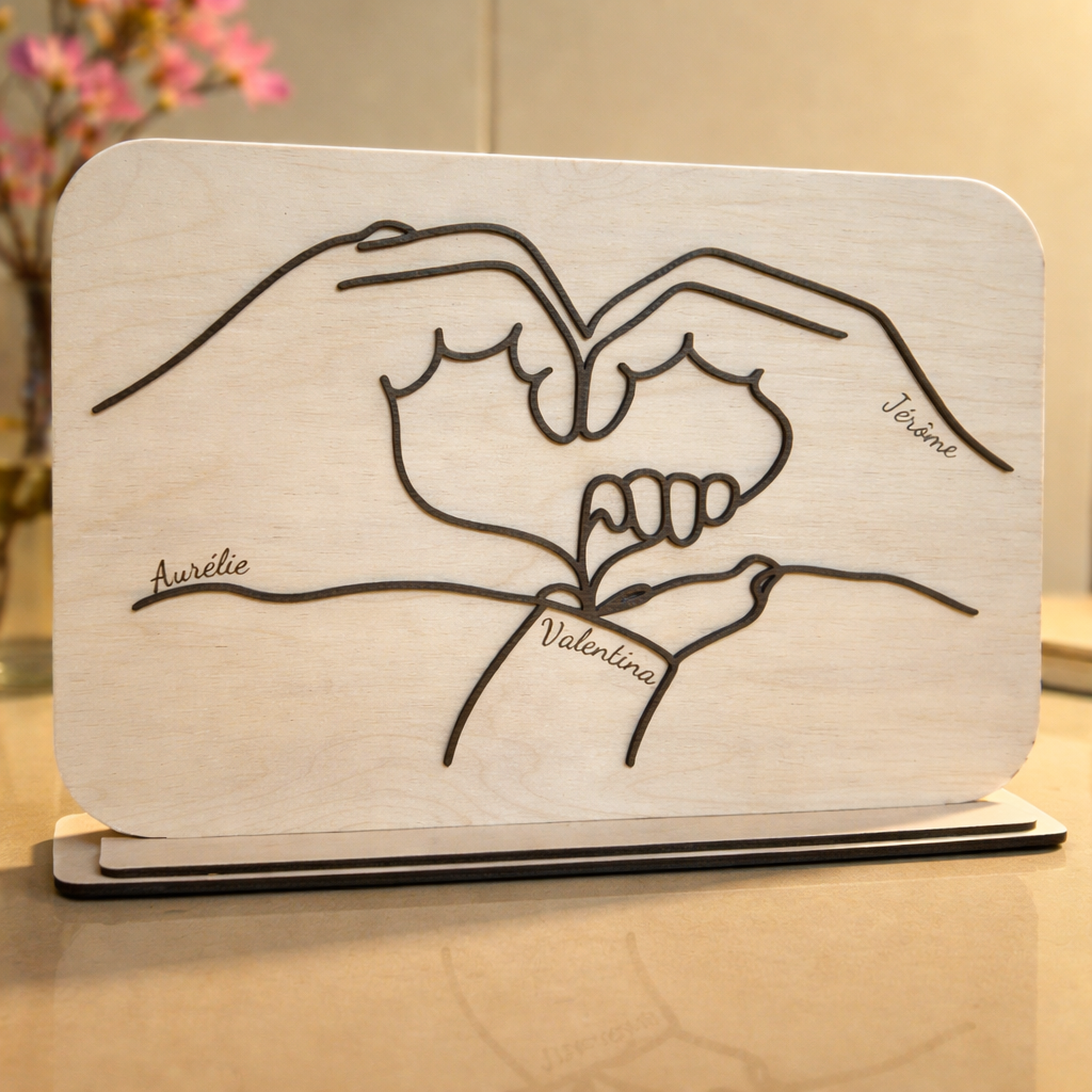 Ce cadre décoratif personnalisé en bois de 30 x 20 cm représente des mains entrelacées formant un cœur, symbole fort de famille, d’amour et de lien indéfectible.