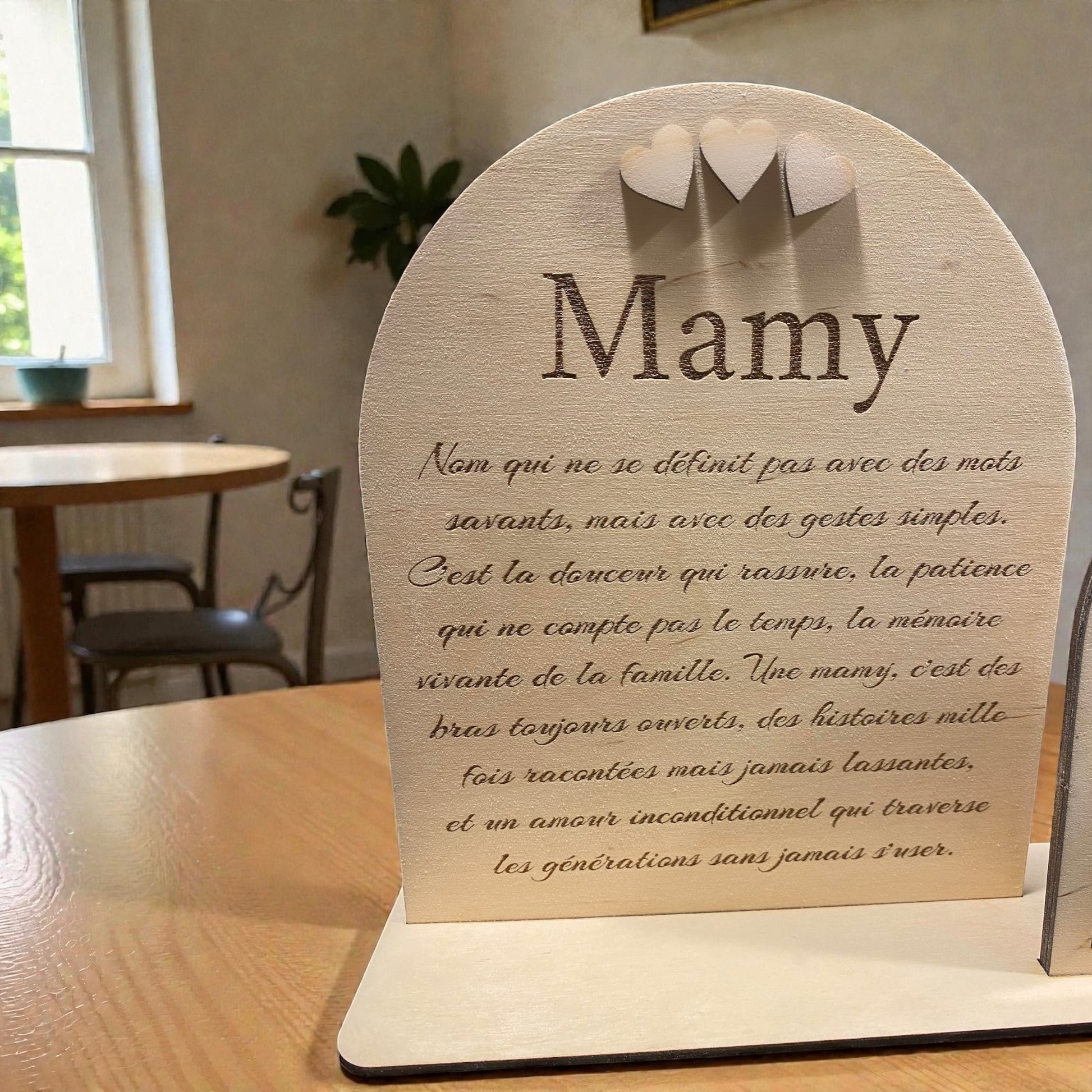 Réalisé en bois clair, ce cadre en bois personnalisé mesure 28 cm de large sur 20 cm de hauteur et associe un panneau gravé d’un texte, surmonté de trois cœurs en relief, à un emplacement photo prévu pour une photo au format 10 × 15 cm, dont le haut devra être recoupé en arc afin de s’adapter parfaitement à la forme du cadre.